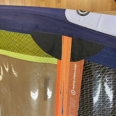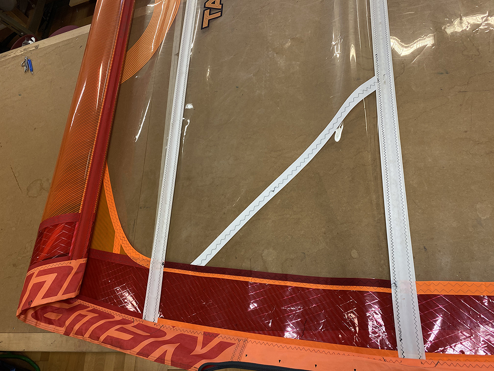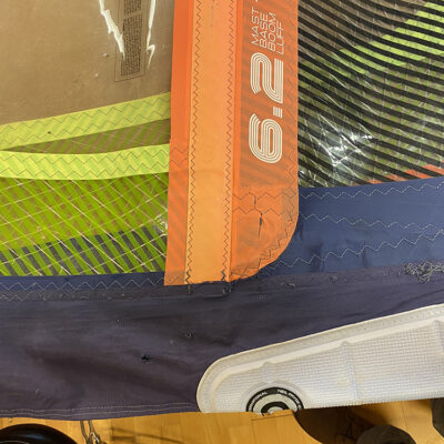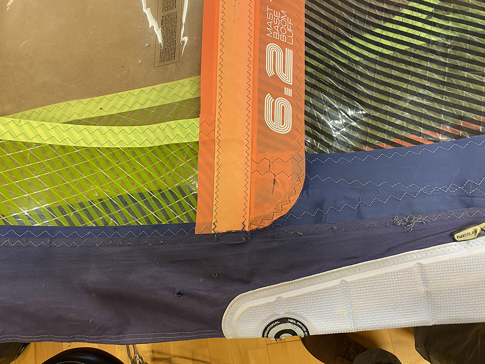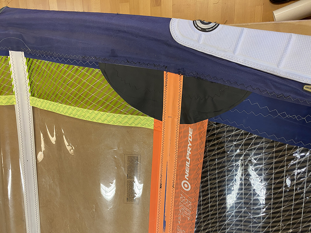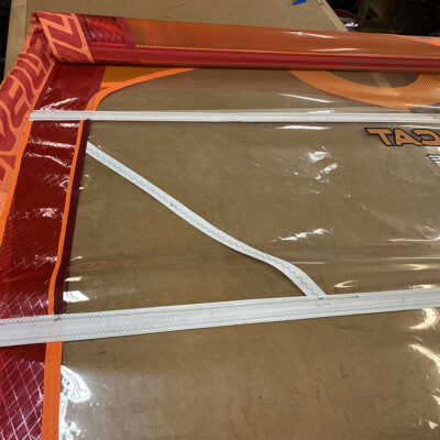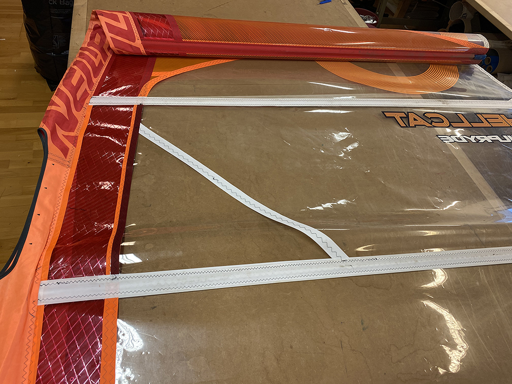 Das Surfsegel hatte einen Riss im Vorliek in der Masttasche und zusätzlich einen Riss im Fenster. Alle zerrissene Teile wurden feinsäuberlich entfernt und mit den passenden Materialien ersetzt.