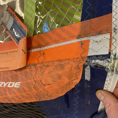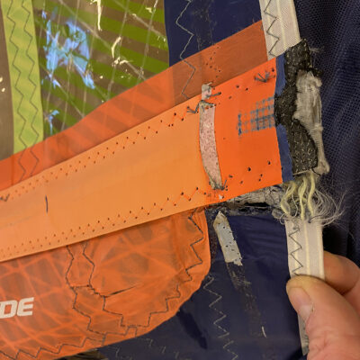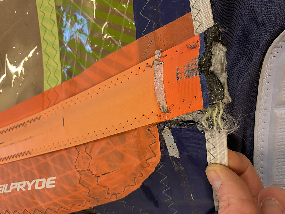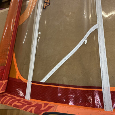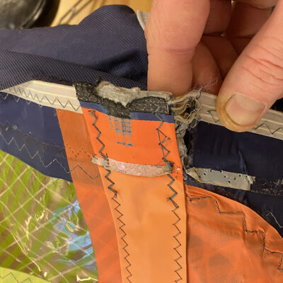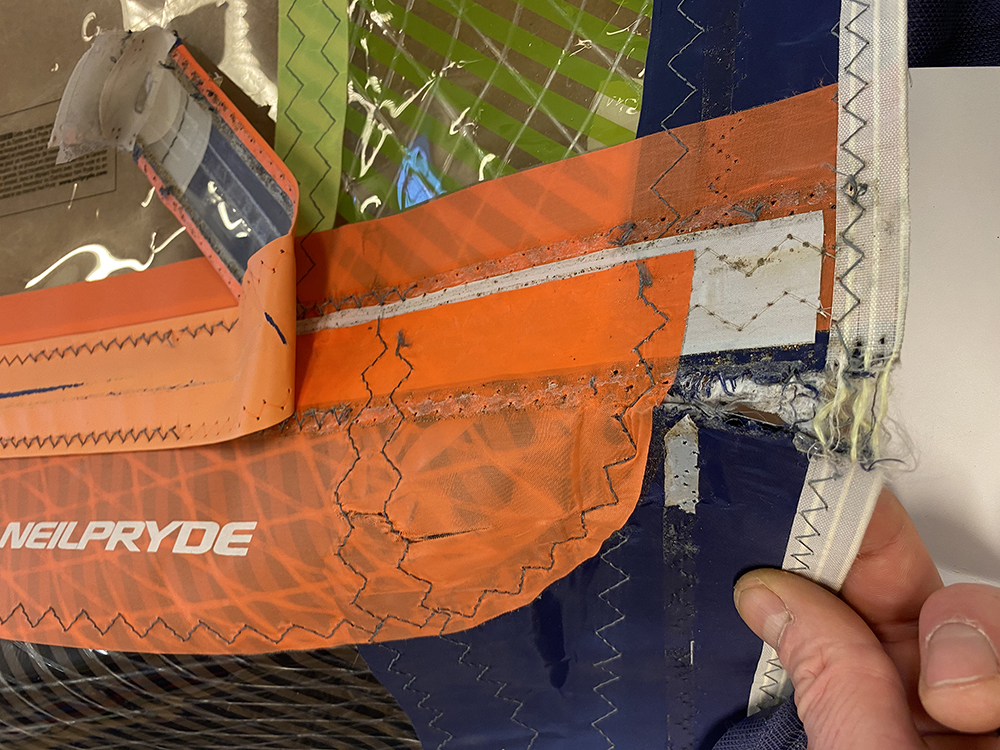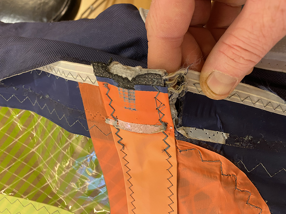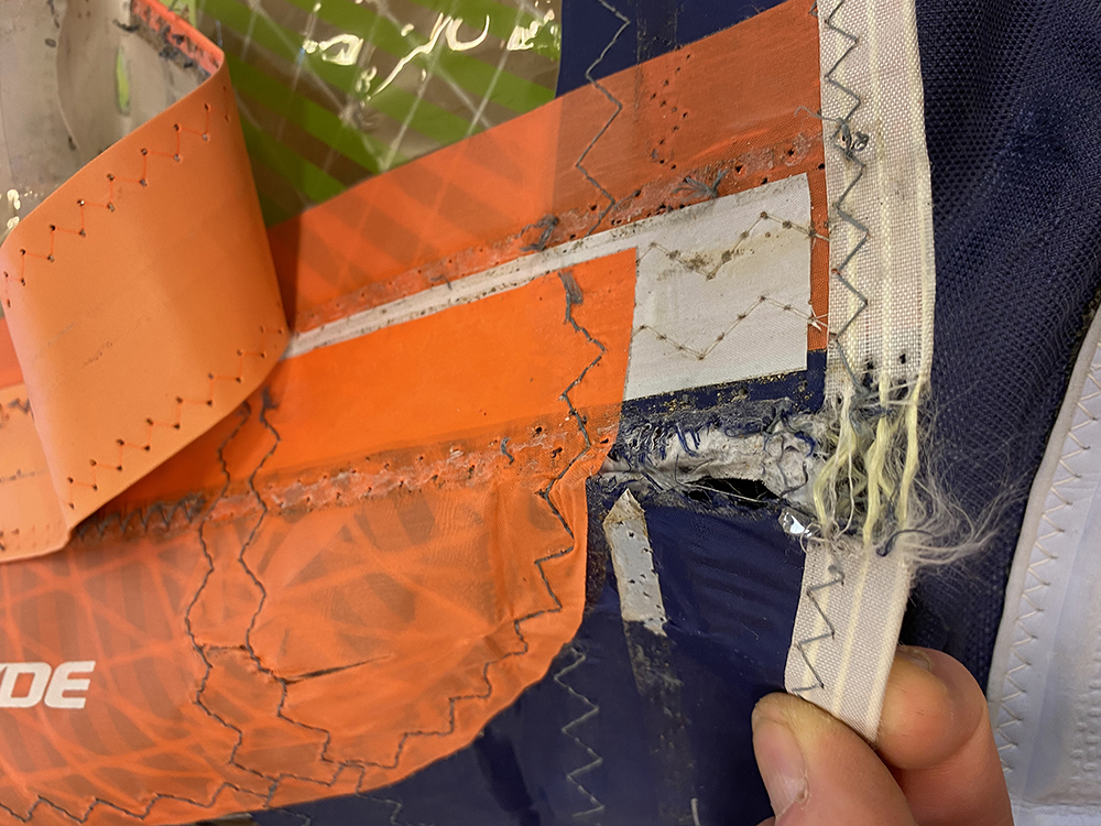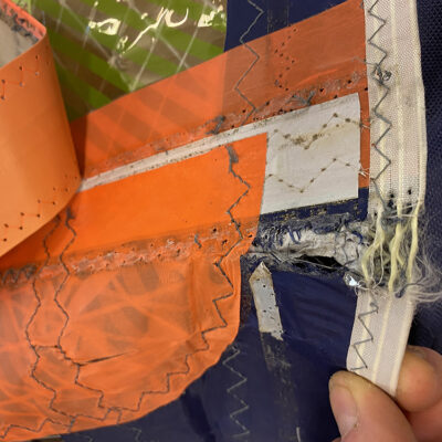 - Masttasche und Lattentasche auftrennen, Rep. Stelle freilegen, Verstärkung tapen, nähen, Taschen wieder zunähen